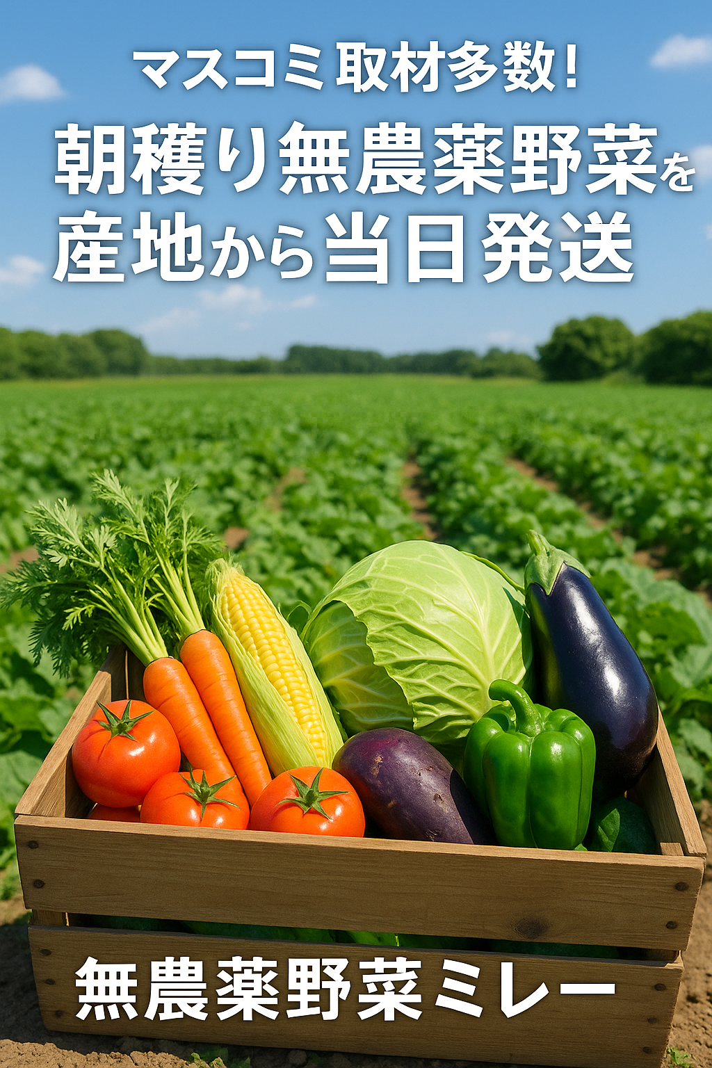 「無農薬野菜ミレー」は、**千葉県にある契約農家が育てた無農薬・無化学肥料の野菜**を、お客様の食卓へ産地直送でお届けする専門サービスです。安全性が高く、栄養価に優れた野菜のみを厳選して取り扱っており、「**朝穫り野菜を当日発送**」という驚きのスピードと鮮度を強みとしています。