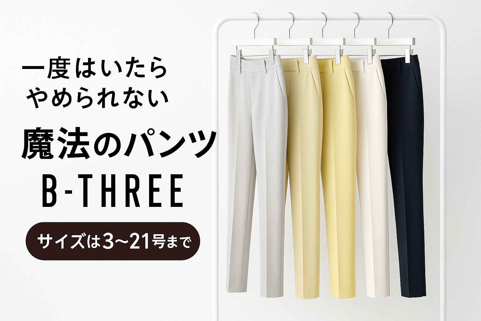 【B-THREE(ビースリー)】のパンツは、「**一度はいたらやめられない**」と多くの女性に支持される、驚きの履き心地を実現したストレッチパンツ専門ブランドです。「体型に自信がない」「履き心地の良いパンツが見つからない」「長時間履いても疲れないものが欲しい」という、パンツ選びの悩みを抱える女性のために開発されました。