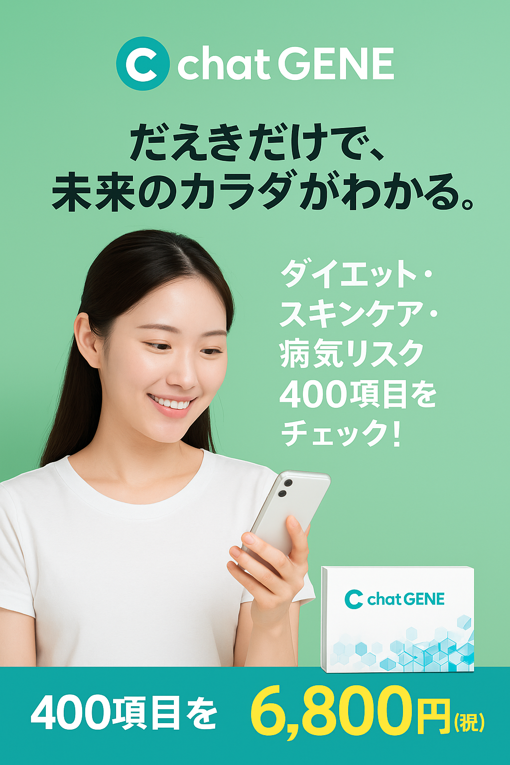 本記事は、遺伝子検査chatGENEに関する**アフィリエイトプロモーション**であり、商品の販売元は(chatGENE運営会社名)様です。