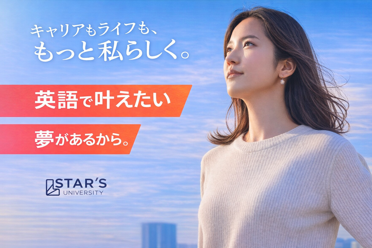 【STAR’S UNIVERSITY】は、**英語でキャリアもライフも理想を叶えたい**と願う20~40代の女性に特化した、実践型英語コーチングプログラムです。「英語を話す」スキル習得にとどまらず、その先の**「英語を使って働く」「自分らしく生きる」**という目標までをサポートします。