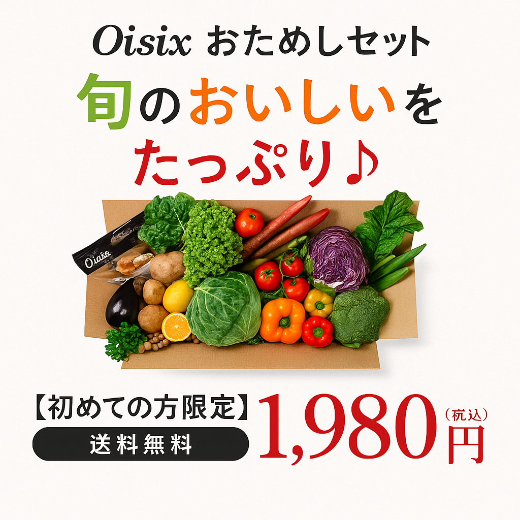 Oisixの人気食材とミールキットが試せる初回限定の「おためしセット」。旬の野菜や時短食材が充実。セット内容・価格は販売ページで確認できます。